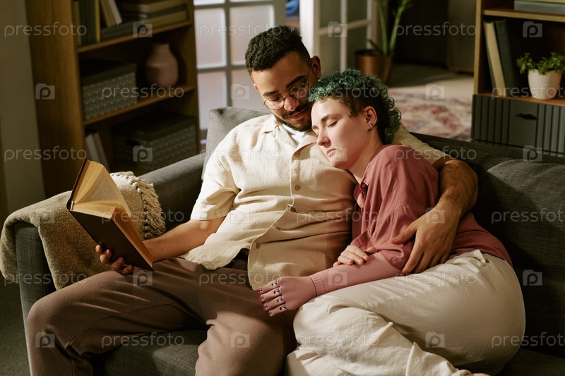 Женщина с протезированной рукой, отдыхающая на молодом человеке, читает книгу