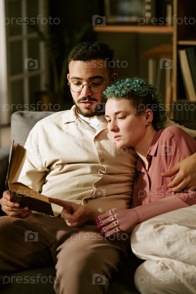 Молодая взрослая пара читает книгу вместе на диване, обнимаясь