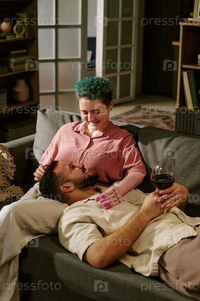 Молодая женщина с протезированной рукой отдыхает с молодым человеком на диване