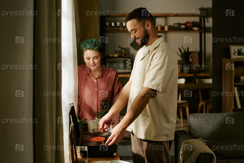 Молодая женщина и молодой человек слушают виниловую запись в помещении