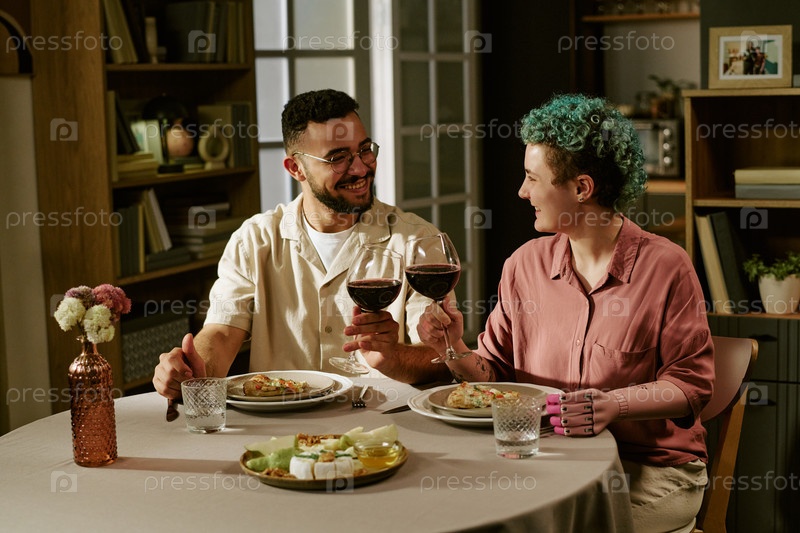 Молодой человек и молодая женщина с протезированной рукой наслаждаются ужином вместе