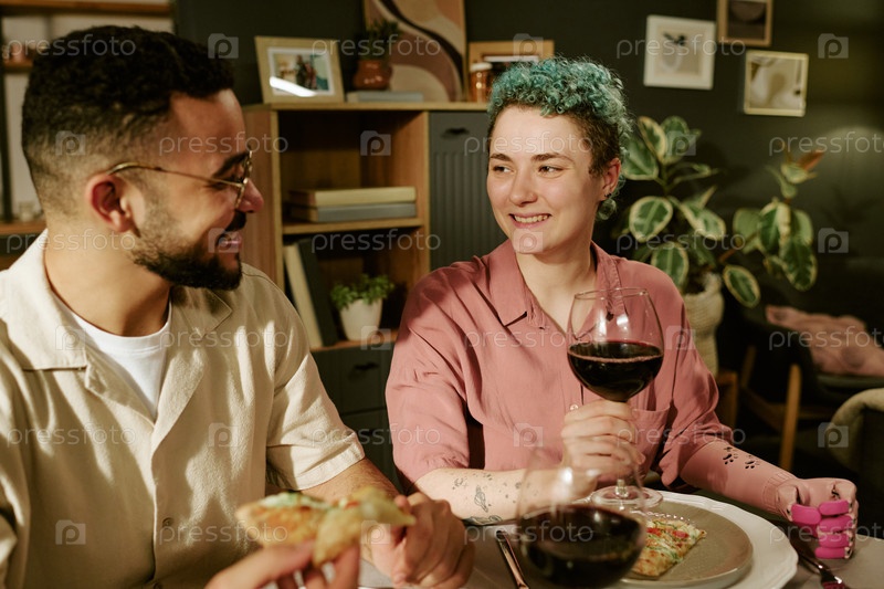Молодая женщина и молодой человек наслаждаются ужином и пьют красное вино вместе