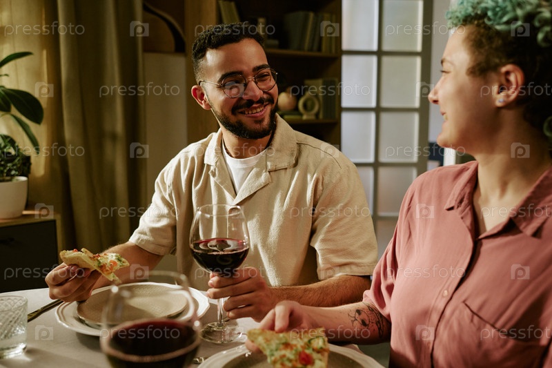 Молодой человек улыбается, наслаждаясь ужином с молодой женщиной в помещении