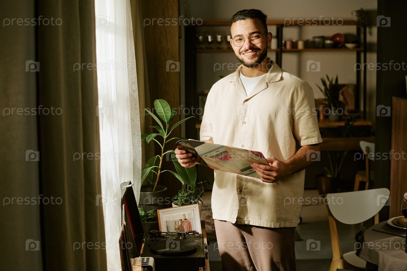 Портрет молодого взрослого человека, улыбающегося в то время как он держит виниловую пластинку