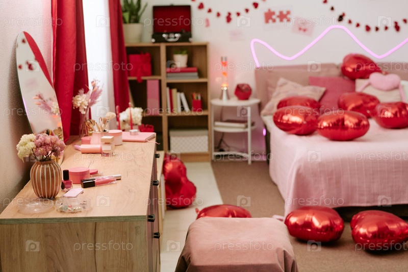 Романтическое украшение спальни с баллонами сердца, празднующими День святого Валентина