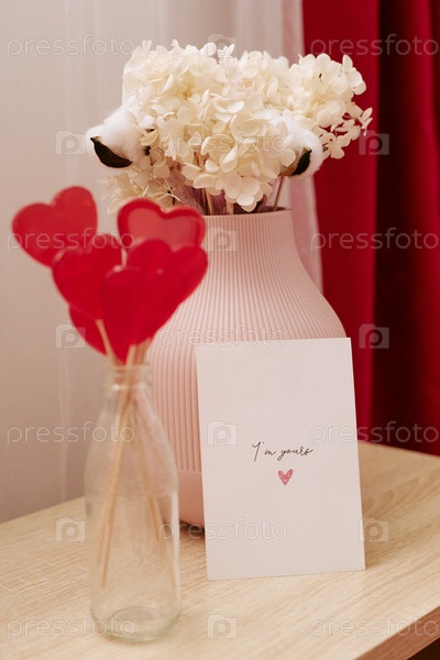 Карта на День Святого Валентина с декорациями сердца и цветами, расположенными на столе