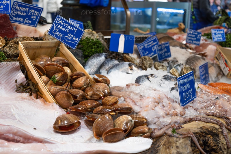 Свежие моллюски и морепродукты на льду в киоске рыбного торговца на рынке Боро, Лондон