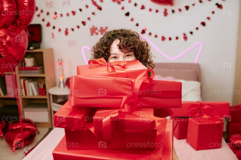 Молодая женщина, улыбающаяся за коробками для подарков, празднует День святого Валентина