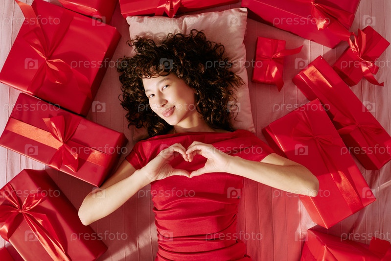 Портрет молодой взрослой женщины, лежащей среди коробки с подарками и делающей сердечный жест