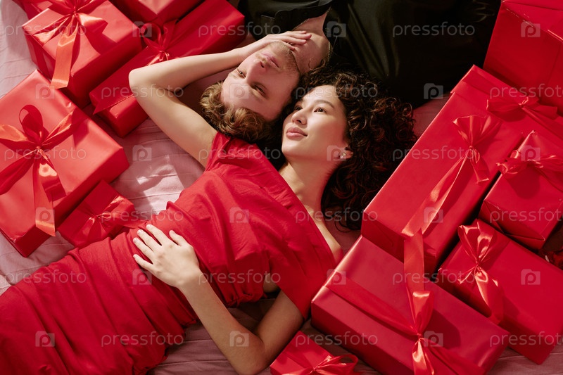 Молодой мужчина и молодая женщина, лежащие среди коробки с подарками, празднуют день святого Валентина