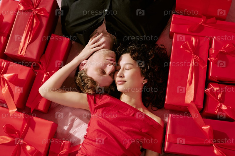 Молодой мужчина и молодая женщина лежат в окружении коробки с подарками