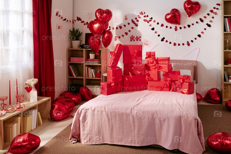 Баллоны на День Святого Валентина и коробки для подарков, расположенные на кровати в декорированной комнате