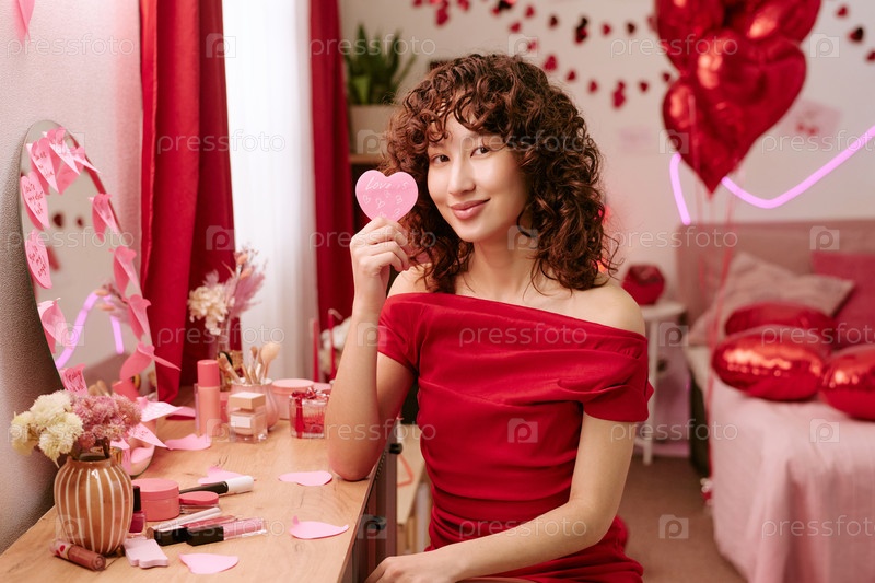 Портрет молодой взрослой женщины, улыбающейся, держащей карту в форме сердца, празднующую День святого Валентина