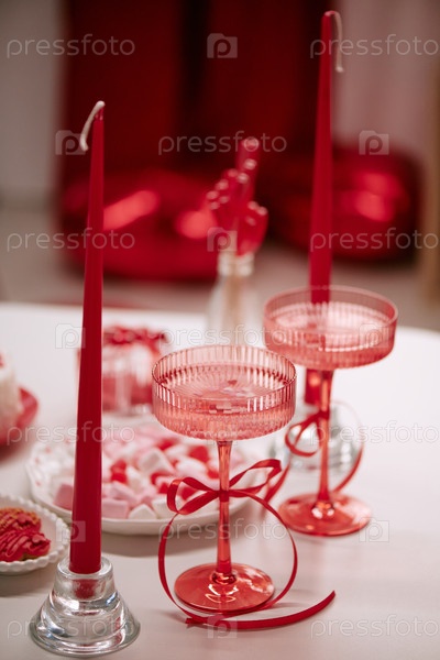 Романтическое столовое убранство с красными свечами и сладостями, отмечающие День святого Валентина