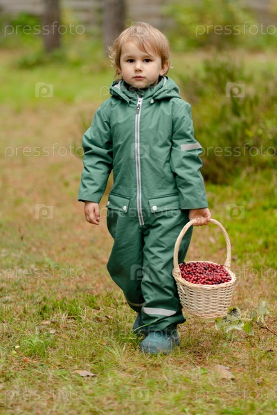 Маленький мальчик гуляет по осеннему лесу с корзиной клюквы
