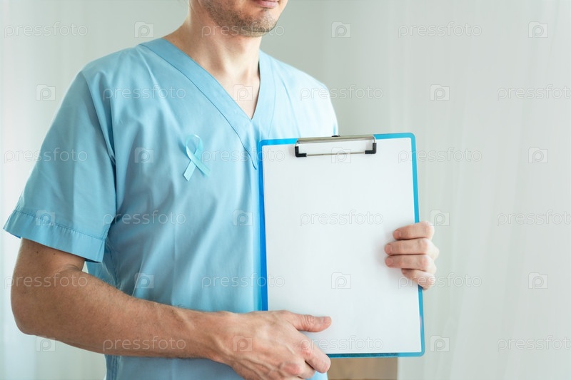 Закрытый врач-мужчина в униформе с синей атласной лентой и буклеткой. Пустой список для контрольного списка или напоминания. Ноябрьский месяц осведомленности о раке предстательной железы и ранняя медицинская диагностика