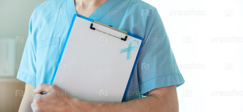 Ближайший медицинский работник держит в руках доску с голубой лентой и пустую форму.Горизонтальный баннер для ноябрьской кампании по информированию о раке предстательной железы, профилактике заболеваний и диагностической поддержке