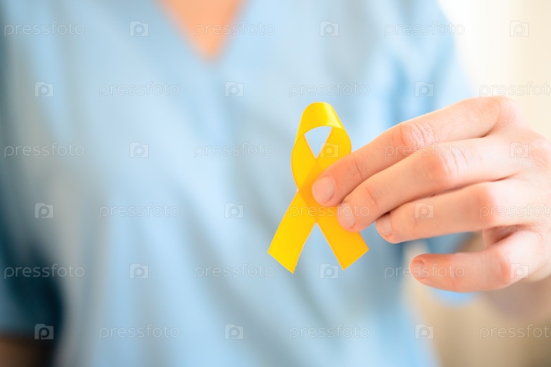 Закрыть униформированного работника здравоохранения, держащего перед собой желтую ленту.Ображает поддержку детей с раком, своевременную медицинскую помощь, диагностику, лечение, уход за семьей и осведомленность