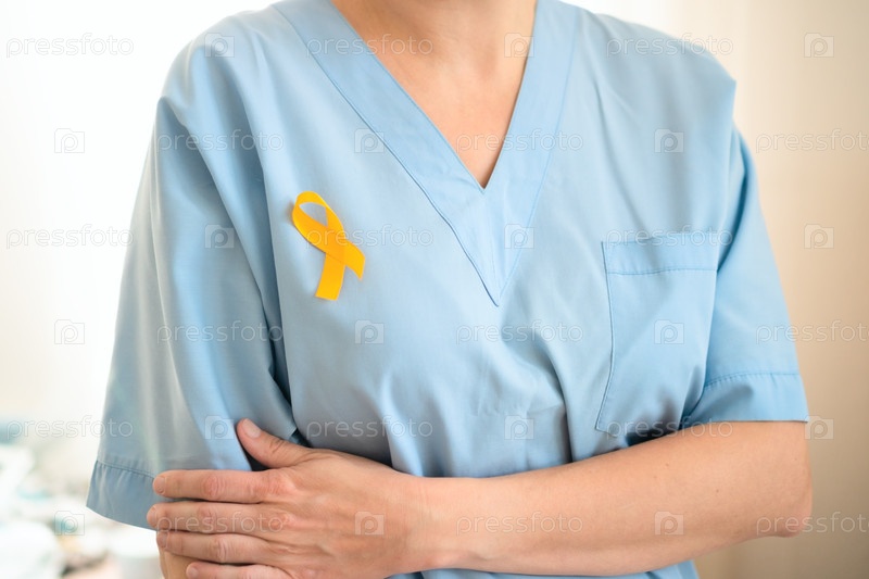 Женщина-врач с желтой ленточкой на униформе