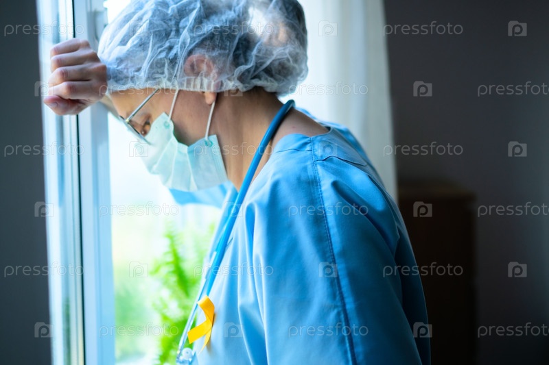 Усталая женщина-медик с желтой атласной ленточкой на униформе глубоко думает о лечении пациентов, одновременно выполняя тяжелую работу в медицине