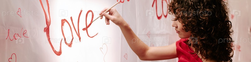 Heder молодой женщины рисует любовное слово на стене празднуя день святого Валентина