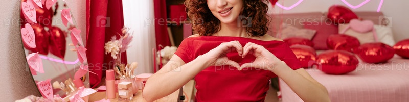 Header of Женщина улыбается, делая руки в форме сердца внутри дома