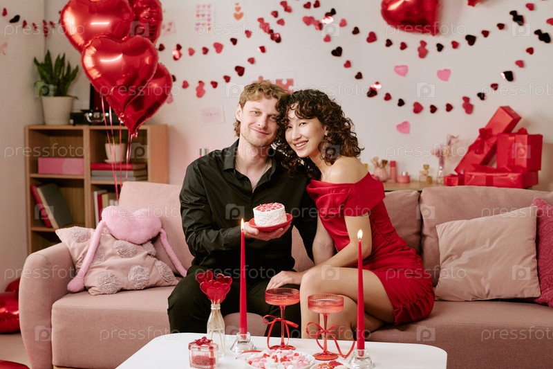 Молодой мужчина и молодая женщина празднуют День святого Валентина, сидя вместе