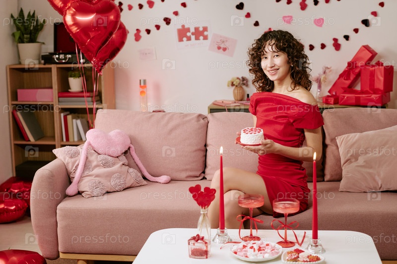 Портрет молодой взрослой женщины, улыбающейся в то время как она держит Валентинский торт