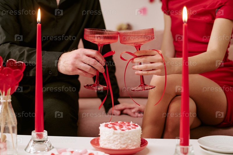 Молодая пара празднует День святого Валентина, выпивая шампанским бокалом