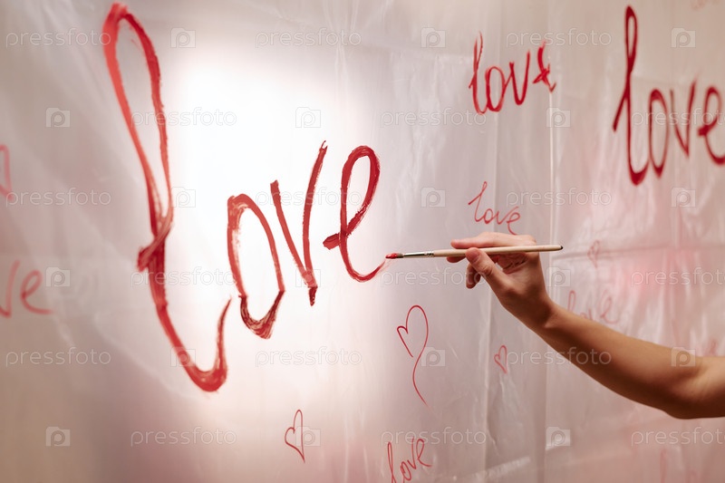 Молодая взрослая женщина рисует любовное слово и сердца на День святого Валентина