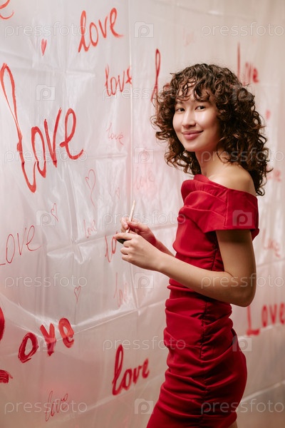 Молодая взрослая женщина улыбается при написании любовных сообщений на День святого Валентина