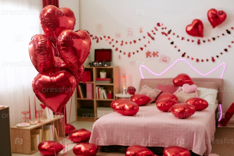 Сердечно-образные воздушные шары заполняют романтическую спальню для празднования Дня святого Валентина