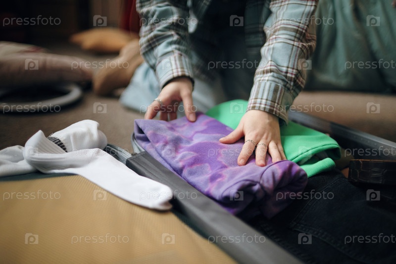 Молодая женщина упаковывает одежду в чемодан, готовясь к поездке