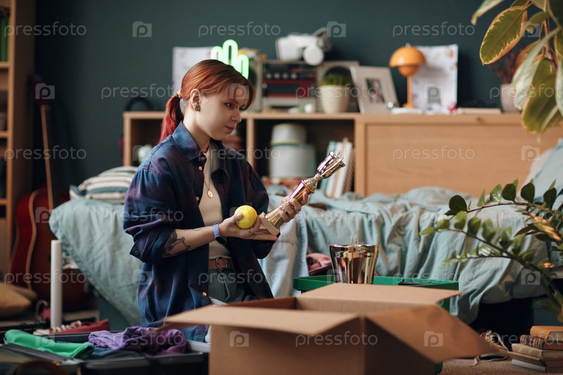 Молодая женщина упаковывает трофеи и личные вещи в спальне