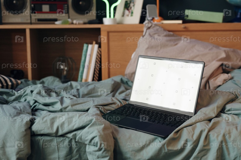 Ноутбук с пустым экраном, отдыхающий на незаготовленной кровати в уютной домашней спальне