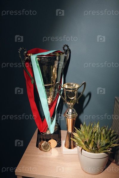 Трофеи и медали, выставленные на деревянном столе в честь спортивных достижений