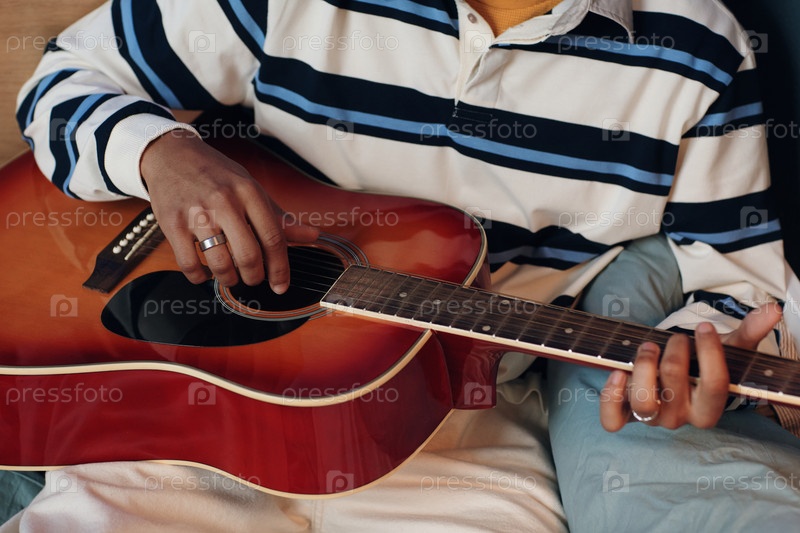 Руки молодого чернокожего человека, играющего на акустической гитаре в спальне