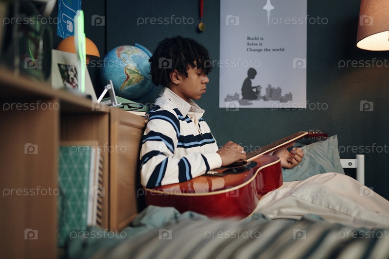 Мальчик-подросток сидит на кровати и играет на акустической гитаре в спальне