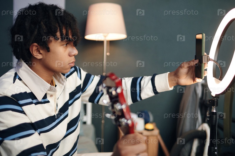 Юный чернокожий мужчина записывает гитарное видео с помощью смартфона и кольцевого света