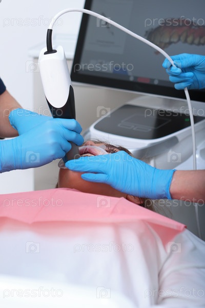 Стоматологическое сканирование в стоматологии.Исследование зубов, десен и слизистой оболочки рта.Стоматологическое оборудование, устройство для сканирования зубов