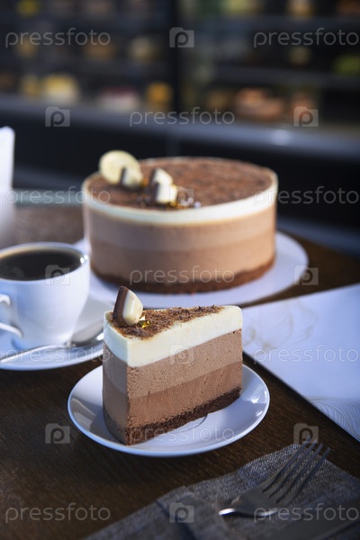 Многослойный шоколадный торт. кусок пирога на тарелке. верх торта украшен белыми и коричневыми шоколадными слитками. фото выпечки