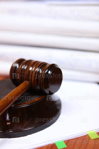 Пакеты судебных дел. Судейский молоток. Понятие порядка и закона. Символ справедливости