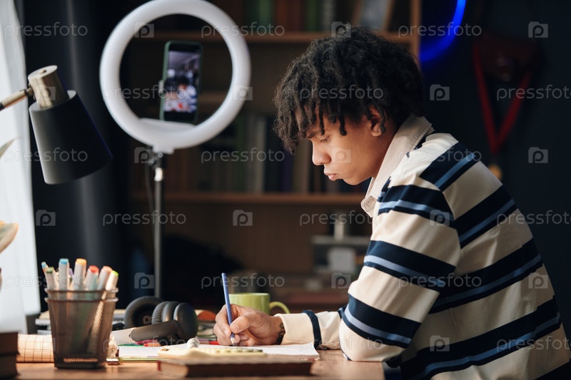 Чернокожий подросток учится за рабочим столом, записывая видео со смартфоном
