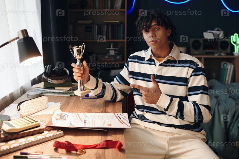Портрет молодого чернокожего человека, сидящего за столом Holding Trophy