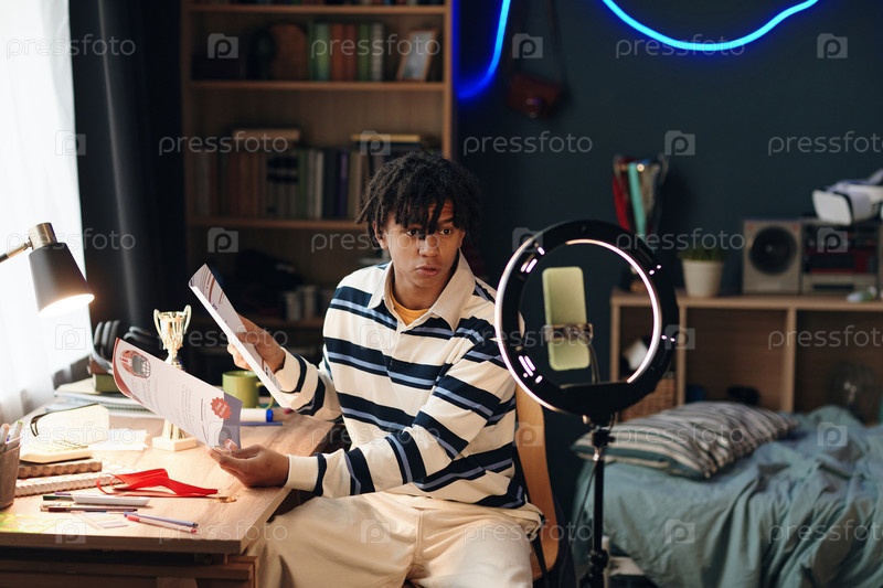 Молодой взрослый чернокожий мужчина, представляющий сертификаты во время онлайн-трансляции