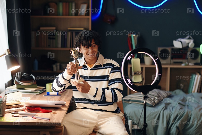 Молодой чернокожий мужчина улыбается, представляя трофей во время трансляции
