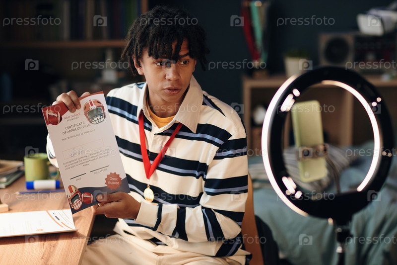 Молодой чернокожий мужчина представляет сертификат признательности во время Livestream