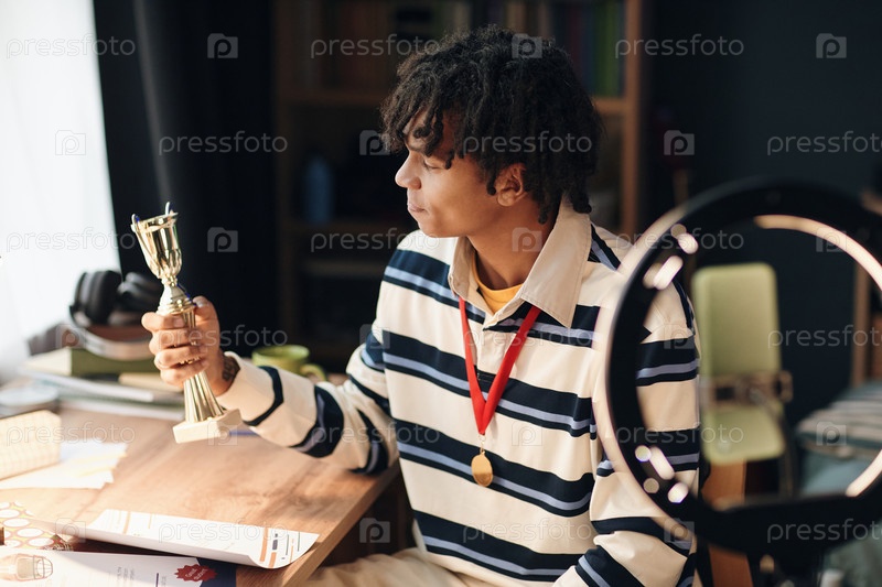 Молодой чернокожий мужчина, носящий медаль, сидит за столом и держит трофей