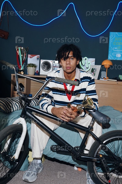 Портрет молодого чернокожего мужчины, сидящего с велосипедом и держащего трофей
