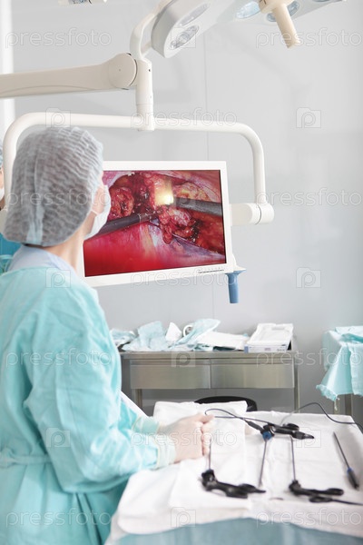 медсестра смотрит на монитор во время операции. инструменты лапароскопической хирургии находятся на операционном столе. современная медицина. концепция здоровья и медицины